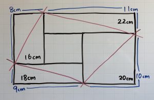 長方形のまわりの長さは、斜めで半分に切ると全部のまわりの長さの半分になりますね。