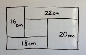 下の図は大きな長方形を、5つの長方形に分けたもので、長方形の中に書かれている数字は、それぞれの長方形のまわりの長さです。大きな長方形のまわりの長さは何cmですか?