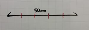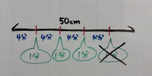 まず50cmの棒を5本に切りわけるときは、何回切ったらよいでしょう?答えは4回です。