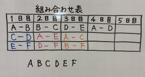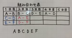 ここでA~Fまでのチームがどのチームと試合をしていないかを確かめると、おのずとマスを埋められます。