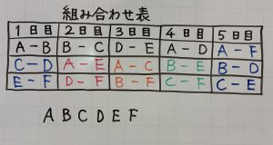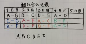 A,B,C,D,E,Fの6チームがそれぞれ、毎日1試合ずつ、5日間で5試合します。図は5日間の試合の組み合わせ表の一部です。同じ相手とは1回しか対戦しません。