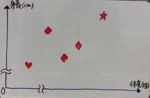 こうじくん、みつおくん、たかしくん、まさきくん、ひろしくんの5人が、体重と身長をはかり、下のように1つのグラフにマークであらわしました、