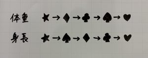 身長に注目すると、♢か♧のどちらかです。体重に注目すると重い順にひろし→まさき→こうじ だったので☆か♢のどちらかです。共通しているのが♢です。