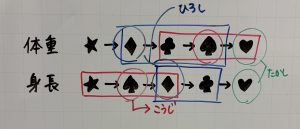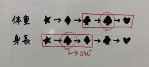 こうじ は、身長は高い方から3番目以内で、体重は軽いほうから3番目以内なので、共通する♤が こうじ ということになります。