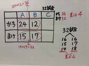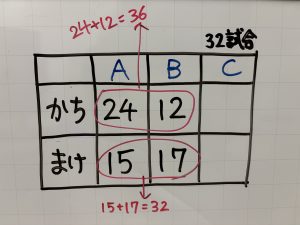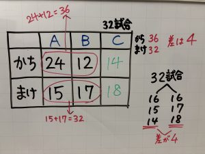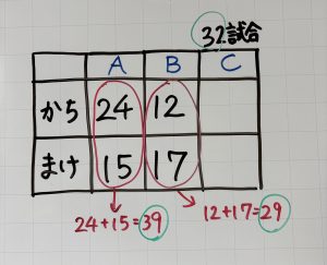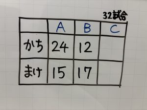 A,B,Cの3チームが、1年間、ドッジボールの試合をしました。その結果、Aチームは24試合勝ち、15試合負けました。Bチームは12試合勝ち、17試合負けました。