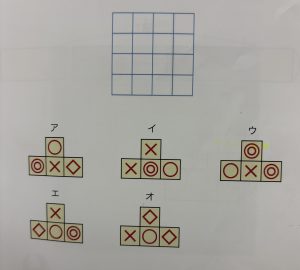 たて、よこ、それぞれの列に、同じマークが2コ以上入らないようにア~オのピースをはめましょう。