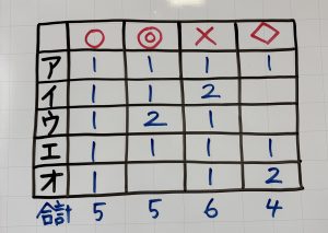 そうすると、〇が1こ、×が2こ、◎が1こ 多いことがわかります。