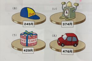 下の4つの品物のうち、おつりをもらわないで買うことができるのは(あ)、(い)、(う)、(え)のどれですか。