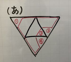 算数的に解いていく方法として、まず正三角形を点線で折ると、正三角形が4つになります。