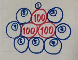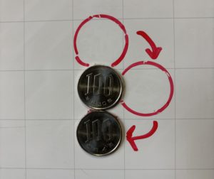 ここで、回る100円玉が元の場所に戻るまでに8か所の○